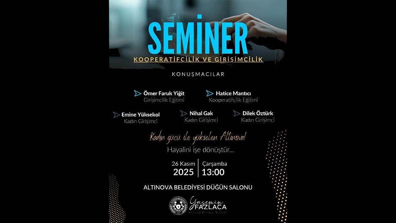 “Kadın gücü ile yükselen Altınova” sloganıyla duyurulan Kooperatifçilik ve Girişimcilik Semineri, hayallerini işe dönüştürmek isteyen tüm kadınları bir araya getirecek. 26 Kasım 2025 Çarşamba günü saat 13.00’te Altınova Belediyesi Düğün Salonu’nda gerçekleşecek seminerde, alanında uzman isimler girişimcilik yolculuklarına dair ilham veren deneyimlerini katılımcılarla paylaşacak.