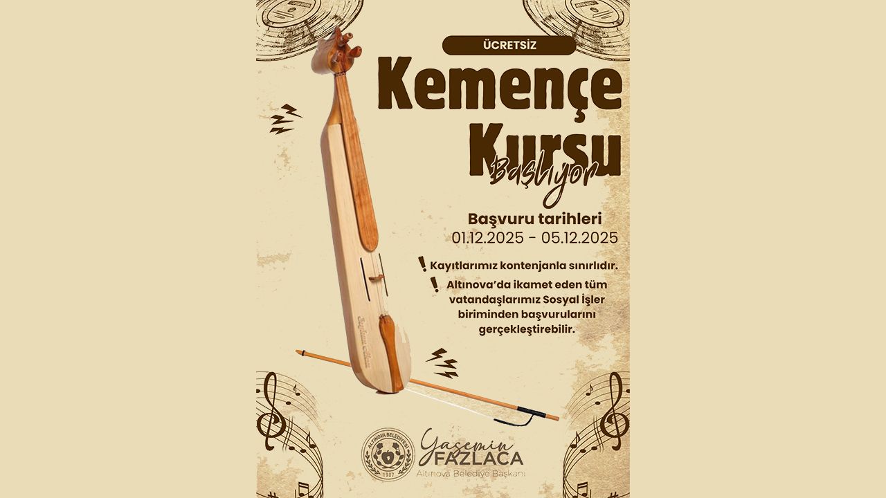 Altınova Belediyesi, yöresel müziğin önemli enstrümanlarından kemençeyi gelecek nesillere aktarmak amacıyla yeni bir kurs programı başlatıyor. Belediye tarafından yapılan duyuruda kursa başvuruların 01 Aralık 2025 Pazartesi günü başladığı ve 05 Aralık 2025 Cuma gününe kadar devam edeceği belirtildi. Sadece Altınova’da ikamet eden vatandaşların katılabileceği kursta, temel kemençe eğitimi verilecek. Başvurular, Altınova Belediyesi Sosyal İşler Birimi üzerinden şahsen kabul edilecek.