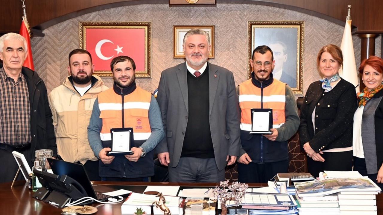 Başkan Gürel, vatandaşlardan gelen olumlu geri bildirimler ve özverili çalışmaları nedeniyle Burak Özgeriş ve Hasan Koç’a başarı plaketi takdim etti.