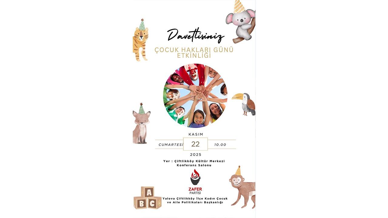 Zafer Partisi Çiftlikköy İlçe Çocuk ve Aile Politikaları Başkanlığı tarafından organize edilen Çocuk Hakları Günü etkinliği, 22 Kasım’da Çiftlikköy Kültür Merkezi’nde gerçekleştirilecek. Kadın Kolları tarafından düzenlenecek etkinlik, 6–10 yaş aralığındaki çocukların katılımıyla tek oturum halinde yapılacak.