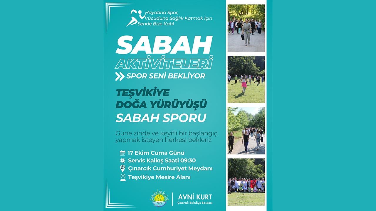 Çınarcık Belediyesi, “Hayatına Spor, Vücuduna Sağlık Katmak İçin Sen de Bize Katıl!” projesi kapsamında doğa ve sporu bir araya getiriyor. Etkinlik, 17 Ekim Cuma günü Teşvikiye Mesire Alanı’nda gerçekleştirilecek. Katılımcılar, saat 09.30’da Cumhuriyet Meydanı’ndan hareket edecek otobüslerle etkinlik alanına ulaşacak. Belediye yetkilileri, etkinliğe tüm vatandaşları davet ederek yürüyüşle hem sağlıklı hem keyifli bir güne başlanabileceğini duyurdu.
