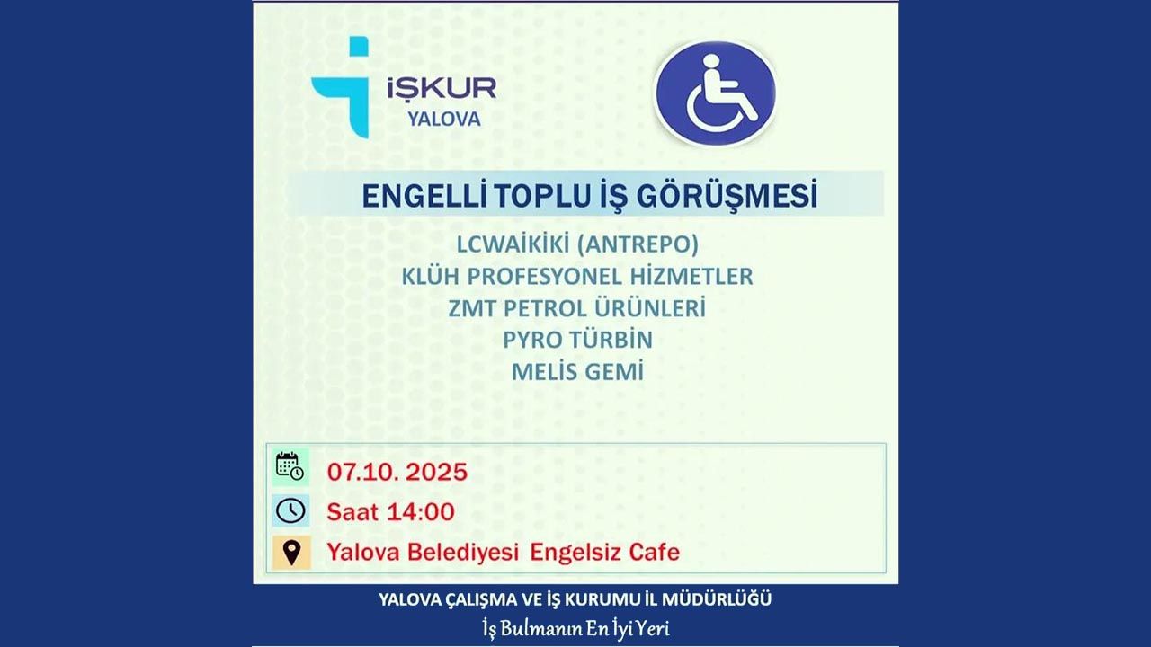 Etkinlik, 7 Ekim Salı günü saat 14.00’te Yalova Belediyesi Engelsiz Kafe’de gerçekleştirilecek. Program kapsamında iş arayan engelli vatandaşlara yönelik toplu iş görüşmeleri yapılacak.