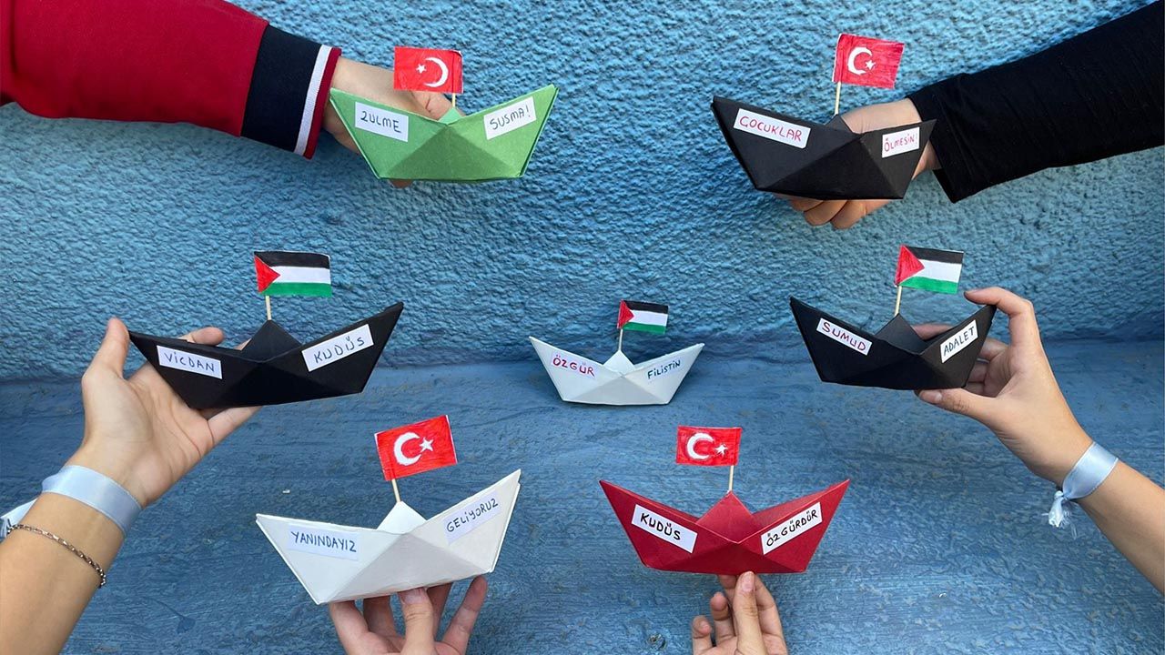 Öğrenciler, kendi yaptıkları küçük filolarla, Gazze'ye gönderilen Küresel Sumud Filosu'na desteklerini gösterdiler. Bu etkinlik, çocukların dayanışma ve empati duygularını pekiştirmeyi amaçlıyor.