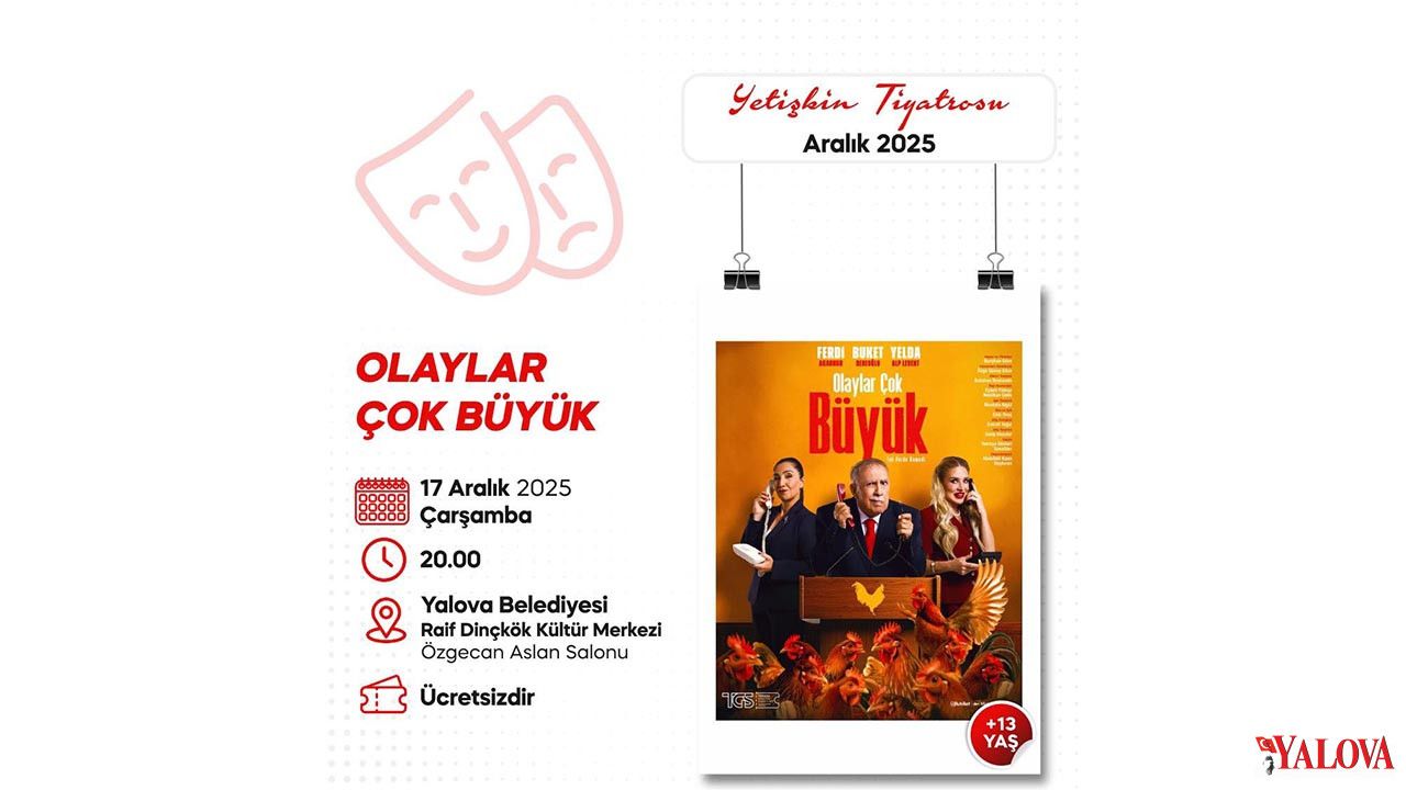 Yalova Belediyesi, kültür ve sanat etkinlikleri kapsamında yetişkinlere yönelik tiyatro oyunlarını Aralık ayında da sanatseverlerle buluşturmaya devam ediyor. Bu kapsamda sevilen tiyatro oyunu “Olaylar Çok Büyük”, Yalova’da sahnelenecek.