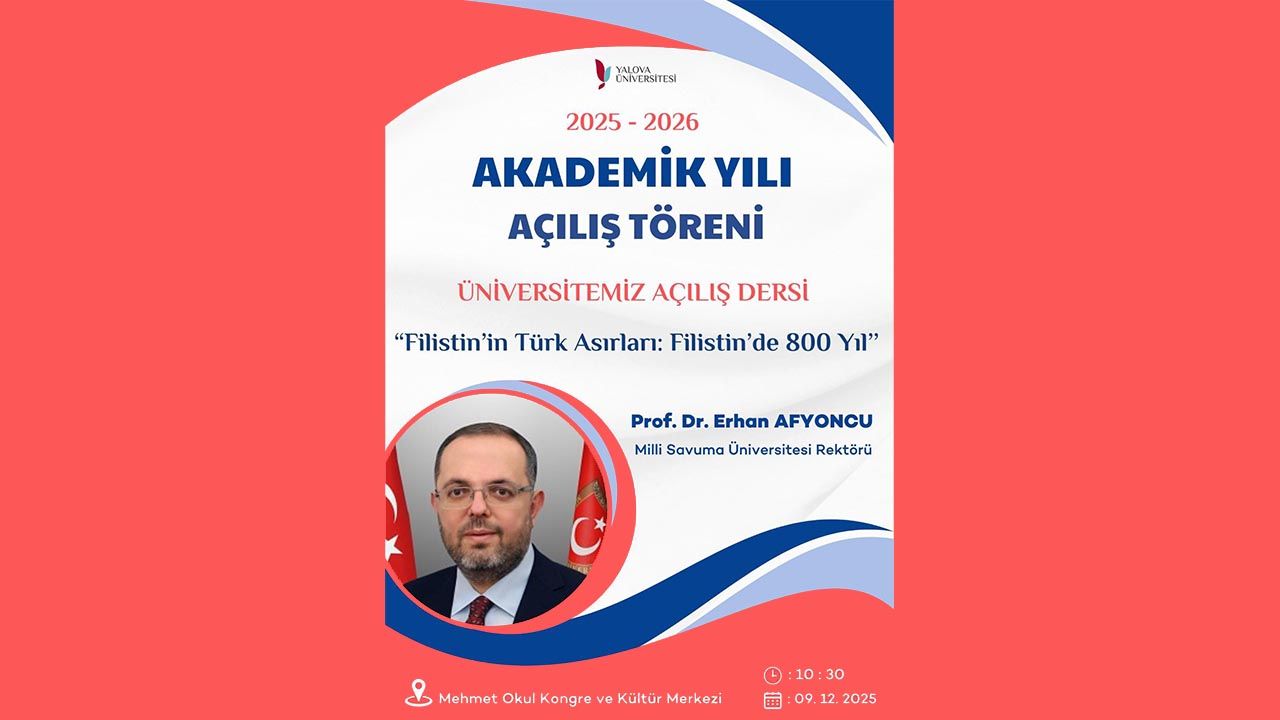 Yalova Üniversitesi, 2025–2026 Akademik Yılı Açılış Töreni’ni 9 Aralık 2025 tarihinde gerçekleştirecek. Mehmet Okul Kongre ve Kültür Merkezi’nde düzenlenecek törende açılış dersini Milli Savunma Üniversitesi Rektörü Prof. Dr. Erhan Afyoncu verecek. Prof. Dr. Afyoncu, “Filistin’in Türk Asırları: Filistin’de 800 Yıl” başlıklı dersiyle akademik yılın ilk sunumunu yapacak. Saat 10.30’da başlayacak törene üniversitenin tüm akademik ve idari personeli davet edildi.
