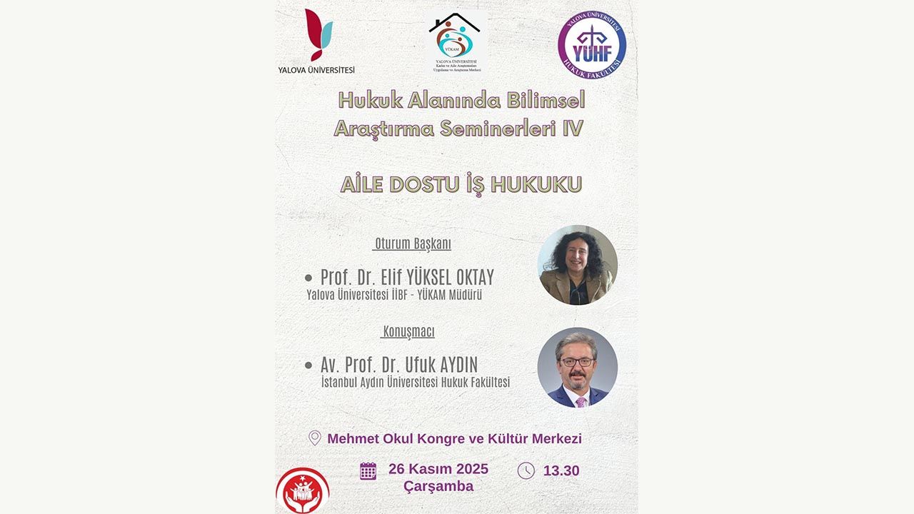 Seminer, 26 Kasım Çarşamba günü saat 13.30’da Mehmet Okul Kongre ve Kültür Merkezi’nde gerçekleştirilecek. Etkinlikte, iş hukukunun aile yaşamı ile dengeli bir şekilde yürütülmesini hedefleyen yaklaşımlar ve uygulamalar üzerine değerlendirmeler yapılacak. Yalova Üniversitesi, tüm akademik personelini ve öğrencilerini seminere davet ederek, katılımcıların bu alandaki güncel gelişmeleri yakından takip etme fırsatı bulabileceklerini belirtti.