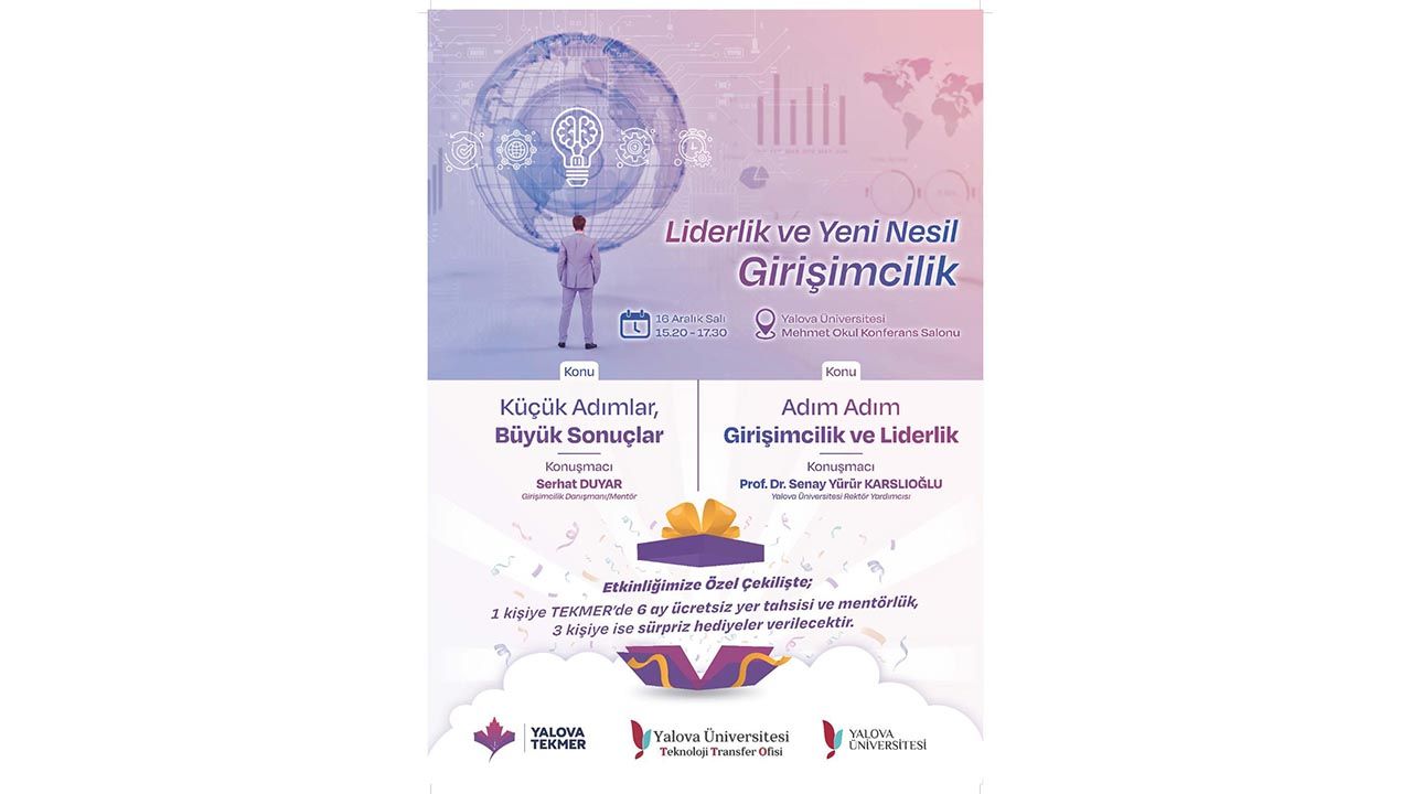 Girişimcilik Danışmanı Serhat Duyar ve Yalova Üniversitesi Rektör Yardımcısı Prof. Dr. Şenay Yürür Karslıoğlu’nun katılımıyla gerçekleştirilecek “Liderlik ve Yeni Nesil Girişimcilik” etkinliğinde, iş dünyasındaki dönüşüm, liderlik vizyonu ve girişimciliğin yeni trendleri öğrencilerle paylaşılacak.